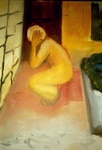 2006op de liggende deur zit een panische verschijning tegen een fel gele achtergrond