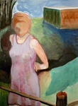 2003Vrouw leunt tegen hek in een groene waterige omgeving